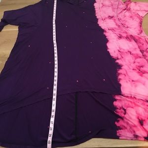 Purple and pink tie dye, over size dress with hi/lo hem. Machine wash rayon/spandex blend.