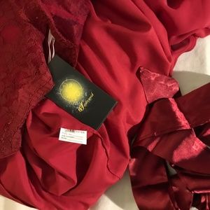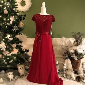 NWT - dark red chiffon bottom with lace top dress. My dresses do tend to run small. So please verify your measurements before ordering. The chart is for your full circumference. If you are using the laying flat measuring method, bust armpit to armpit, then remember you will need to double that number before trying to locate your size on the chart. Any questions just message me.