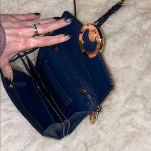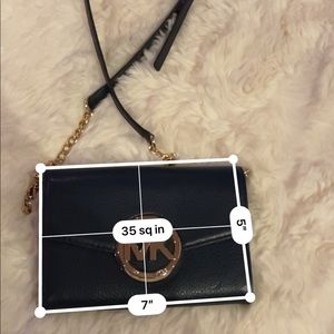 NWOT MICHAEL KORS NAVY BLUE PURSE. SMALL WALLET ON CHAIN WITH GOLD HARDWARE. LARGE ENOUGH TO FIT IPHONE 12. POCKET ON BACK. ADJUSTABLE STRAP CAN BE WORN LONG OR SHORT. OPEN TO ALL OFFERS.