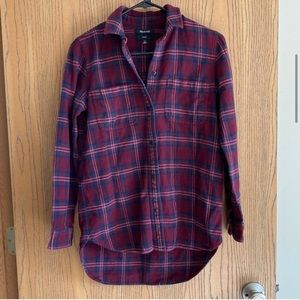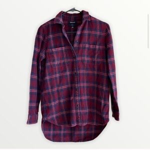 Madewell Classic Flannel. XS. Low curved hem in back. This is the perfect winter/fall flannel! Its soft and warm and in great condition! Maroon/ Purplish Color with green and navy flannel pattern. Wear the sleeves down or roll them up. This is a XS and it is just slightly small on me in the arms and upper back. And I normally would wear a M. Measurements are included in pictures. I would be happy to answer any other questions you might have :)