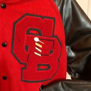 Glory Days Vintage Varsity/Letterman’s jacket by Holloway. Black leather-like sleeves and red wool body knit neck, cuffs and waist. Snap up GB letter and gold tone bars attached size M