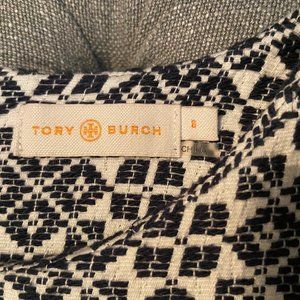 Blue and White geometric pattern knit dress with zipper back and sheath under layer. Drop hem at bottom looks flatters figures.