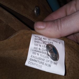 Vintage 1980s (yep, can you believe it? We're vintage now) 100% Genuine leather, Hunter's Run jacket. Size 2X. This piece has never been worn. It has lovingly been stored away in a garment bag. Still has that new leather feel. Lining inside at top is 100% Nylon. Dry clean only. Fringe is in excellent condition. Buttons are described as Navajo Turquoise. Fits big.