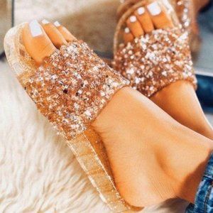 These are dripping with sparkle and bling and these jelly slides are comfy and perfect for the summer season!