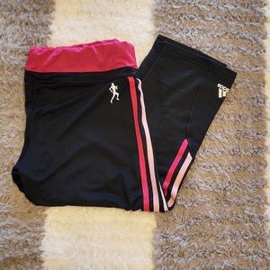 Women's adidas crop athletic leggings. Climalite. Size large, inseam 20.5 inches. Black with pink and white accents. Breast cancer awareness leggings. Pink breast cancer ribbon detail on front right hip.