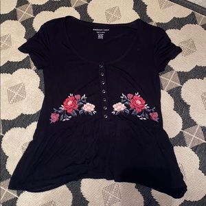 Super soft black shirt from American Eagle’s soft and sexy collection. It has floral embroidery and has only been worn once. It is a size extra small.
