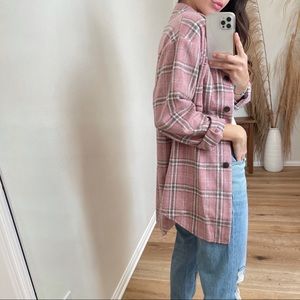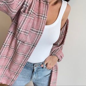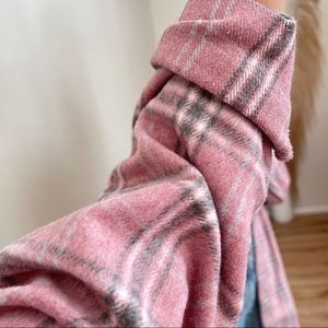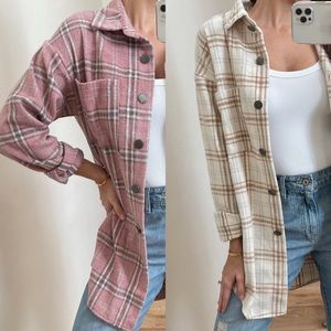 My favorite color tones. So pretty + chic. Medium weight high quality fabric that is practical for cool to cold weather. Has a brushed soft textured exterior with a non brushed interior. that is non itchy. Straight body, rounded hemline, chest pockets, button up closure + wrists.