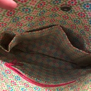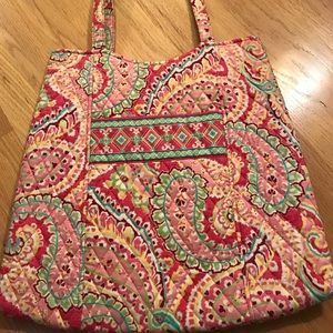 Vera Bradley purse/tote in new condition. Super cute. Does not look used at all. Has a front pouch. The inside has 2 larger pouches and 1 smaller pouch plus a large zippered pouch. The purse/ tote has a Snap closure. Measures 16” in width x 15 1/2”.
