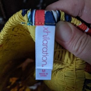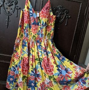 Like new yellow adjustable spaghetti strap sun dress w/ red and blue flowers. Cinches below bust.