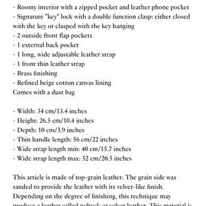 This is a substantial bag with detachable heavy brass key charm and detachable double straps (one brown leather, one blue leather).