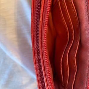Two main pockets and three card slots inside larger section. Some tarnishing on the hardware (pictures). Old but cute :)