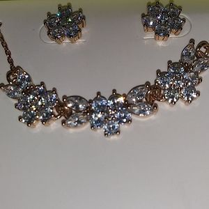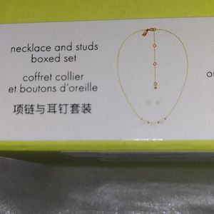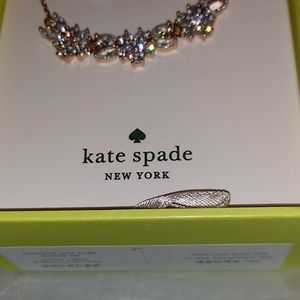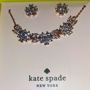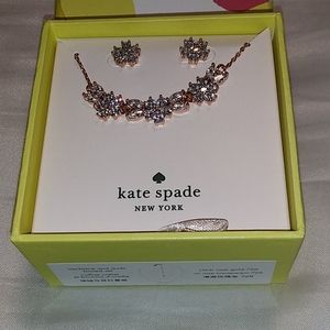 Brand new stunning Kate Spade earring and necklace set. Quite a unique set. Called gleaming gardenia it is in rose gold overlay. The set comes with cubic zirconia earrings and a whole line of cubic zirconia gardenia stones in the front. The chain of rose gold. The chain has a 3-inch extender at the back. It is wonderful to have the stunning matching earrings and necklace together. What a wonderful gift to receive or present to someone you love. Cat happy smoke-free home. Free special wrapping!