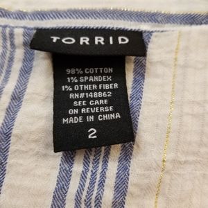 Beautiful women's Torrid lightweight sleeveless top size 2. Vertical blue white and gold stripes. Perfect for warmer weather since it's very breathable.