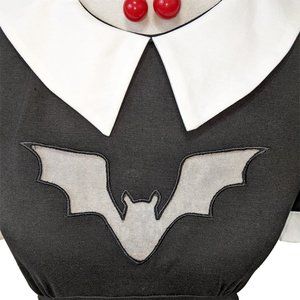 This soft stretch jersey top has a gathered bust and features a fabulous bat cutout across the chest & on the sleeves. The peter pan collar & cuffs are bright white, and the back has a keyhole opening buttoned at the collar with a single black button.