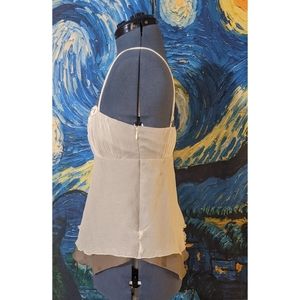 This top features a layered sheer crinkle material in cream draped over a coffee colored bottom layer, with a beaded front design, and adjustable straps!