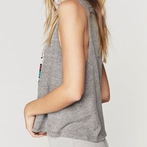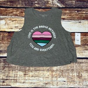 This crop tank features a "Love is the Bridge Between You and Everything" with a heart front graphic.