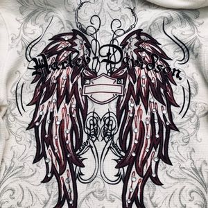 Gorgeous cream colored off-white thermal top with hood. Harley Davison logo down the arm. Beautiful Design all over and across the back. Rhinestones all over. No stones missing no stains no rips no tears. Mint condition