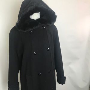 Full length wool coat with button closure. Rabbit fur trimmed hood. Excellent condition