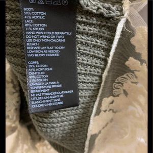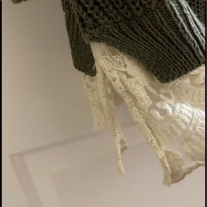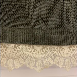 Loose fitting darker green pullover sweater with gorgeous ivory lace along bottom. Side slits.