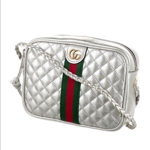 Silver-tone metallic quilted laminated leather Gucci small crossbody bag with antiqued gold-tone hardware, single braided shoulder strap, Double G accent at top featuring green and red Web canvas trim at center, red and multicolor floral print grosgrain lining, three card slots at interior and zip closure at top. Includes care booklets, dust bags and box.