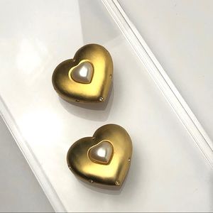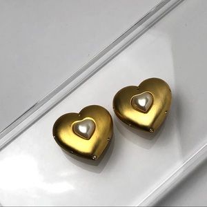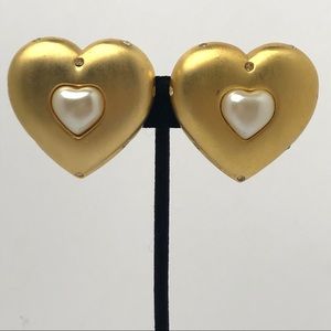 Gorgeous EXTRA LARGE VINTAGE GIVENCHY PARIS NEW YORK HEART EARRINGS. These beautiful Brushed Gold Plated Earrings are Spectacular and Make a Bold Statement Because of The Large Size. They Have Lovely Detail with a Center Faux Pearl and Crystals Around the Edges. Who Doesn’t Love Hearts, Especially Givenchy Hearts. I ❤️ GIVENCHY. Has Some Lite Vintage Wear, Surface Wear. May Need a Gentle Cleaning. Otherwise, Truly Divine. Signed/Stamped. 💛