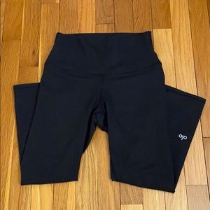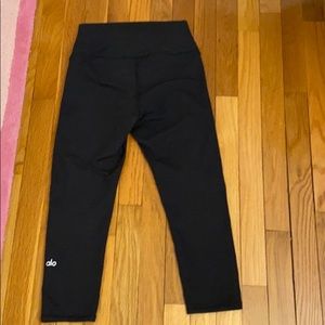 Black high-rise Capri leggings from Alo. Rise is about 9 1/2 inches and inseam is about 19 1/2 inches. Still in good condition, a little bit of pilling. Sizing has rubbed off on the inside, but these are a size small