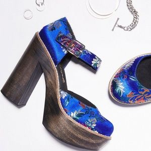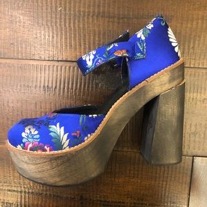 Floral embroidery adds bright color to these retro-inspired Free People pumps. Ankle strap with buckle closure. Chunky wood heel and platform. Crepe sole.