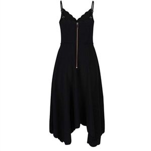 Exposed back zip closure - Scalloped asymmetrical hem.