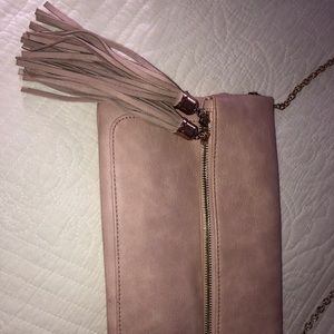 GENTLY WORN. Fits a lot of stuff. Zipper pocket and inside and outside pockets. Removable Gold chain with large tassels. No signs of wear. Very soft leather. Cross body length hits at waist.