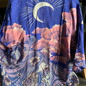 Boho moon star print short kimono with sash tie & wide sleeves pink purple