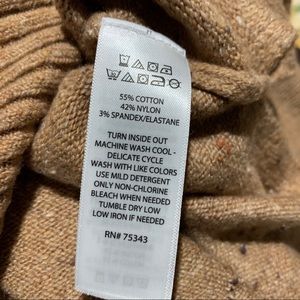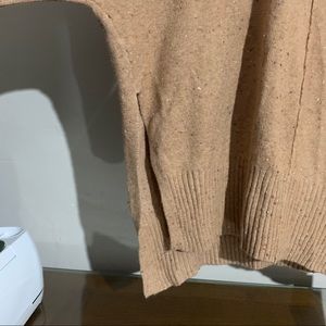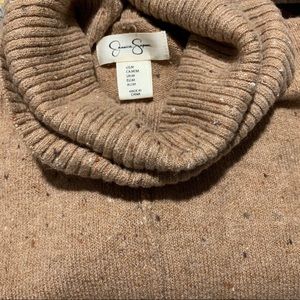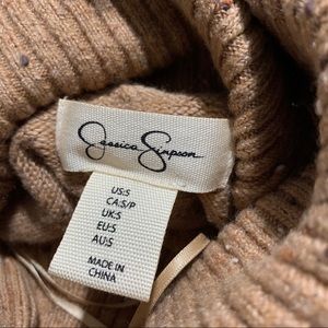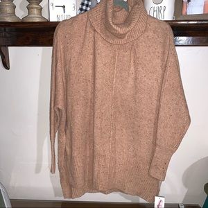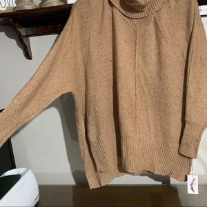 Jessica Simpson cowl turtleneck oversized sweater with hi-lo design at the bottom and split sides very soft warm and cozy stretchy lovely sweater color caramel latte wit flakes,exposed seam center detail,dolman sleeves “the picture doesn’t make justice”material is 55%cotton 42% Nylon 3% Elastane any Questions please let me now before you buying thankyou measurements by request!!”the last picture its from internet and just to give some ideas how fits isn’t the same color ,just the model!!”