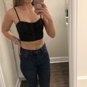 Perfect condition black washed out crop top with adjustable straps. Front has hook loop design, but it doesn’t actually come undone. Only way to get this on and off is over your head. Size XS
