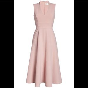 A wear-anywhere V-neck dress sewn with topstitched panels of stretch crepe is cut with a flared skirt that moves gracefully at every turn.