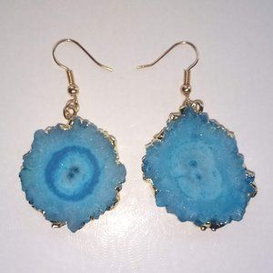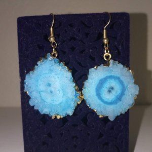 These are natural raw druzzy agate slice earrings. They are round in shape and have 18k gold electroplating around the edges of the stones. Color in person may vary slightly due to lighting differences in screens/cameras.