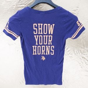 Victoria's Secret PINK NFL Minnesota Vikings "Show Your Horns" jersey t-shirt in XS. Features include jersey-like stitching, "EST '61" appliques on front and "Show Your Horns" with Minnesota Vikings logo on back, and contrasting jersey stripes on sleeves. There is a crack in the banding on what would be the wearer's right arm. This is a well loved item, but has a lot more life in it.