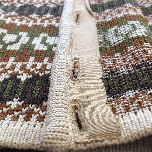 Vintage “Quality Sportswear by Glenhill” 100% Australian virgin wool cardigan. Norwegian inspired knit pattern in ecru caramel dk brown olive green. Lovely feel & not itchy at all. Cool pewterish buttons with a very regal look to them. Very well made with a sort of ribbon behind button holes buttons & along shoulder seam for stabilization and finishing Set in sleeves