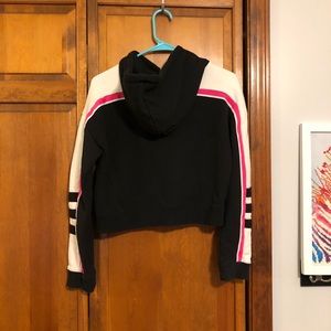 This is an adidas fashion sweatshirt hoodie in a size XS. It also fits a size small which is the size I wear so you can Reference the pictures for size! It is slightly cropped and has a cute design with pink, white, and black details. It is striped white, pink, and black on the arms. The design says adidas the brand with the 3 stripes. It is in perfect condition, no fading and only worn a few times. Let me know if you have any question, feel free to send me an offer! Bundle for and discount 😊