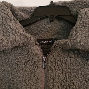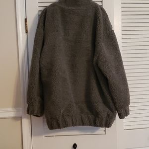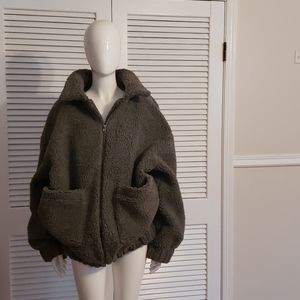Versatile Grey Oversized Borg Pocket Front Coat. Front zip up closure with beautiful chrome zipper and an elasticated hemline.