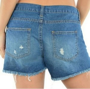 These great ,classic low rise 100% cotton ( real denim) shorts never go out of style starting with their frayed hem and ripped details! The front looks cut out and slightly shorter than the back. Inseam is approximately 2" . Featuring that classic 5 pocket style!