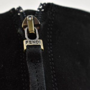 Black, suede leather tall platform boots accented by "Fendi" logo zipper pull