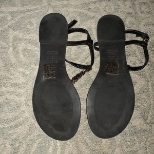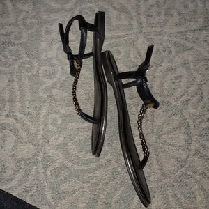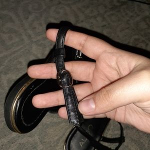 Aldo black leather sandals with gold hardware. Has X hardware detail. With a adjustable buckle. Size 7.5 in womans. I can remember only wearing these about 5 times. Still in good condition but with a bit of scuffs.