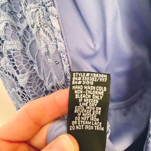 Worn once and Dry Cleaned. Material is detailed in picture. It is a beautiful periwinkle color. It goes on over the head and has two buttons at the back side of the neck once it is slipped over. It is a soft, A-line fall. Beautiful beading.