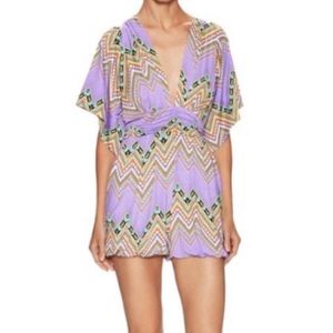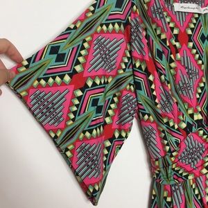 Tribal print, geometric print, kimono romper, tied waist, v neck, Kimono sleeve, 2 side pockets, t-bags Los Angeles was re-launched as MISA Los Angeles in 2016, sold on REVOLVE, model photo is included to show fit, not the same color way