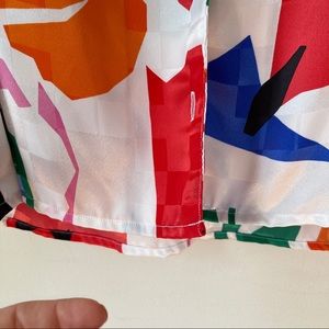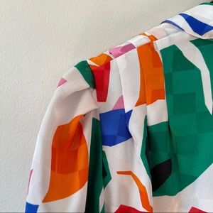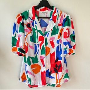 Vintage Lloyd Williams button down blouse. Multi color organic shape pattern on white background. 100% Polyester. Size 6. puff sleeves. short sleeve. button closure on sleeve cuff. Botton button missing and details of this can be seen in last few images.