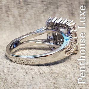 Elegant and glamorous, this sterling silver plated ring features four sparkling princess cut simulated diamonds, set in two halos and accented by additional stones that wrap halfway around the band. Engraved '925". This ring is the perfect statement piece for any occasion!