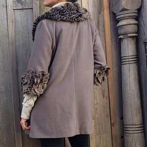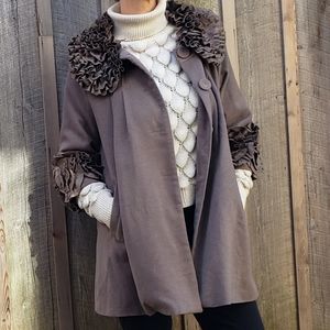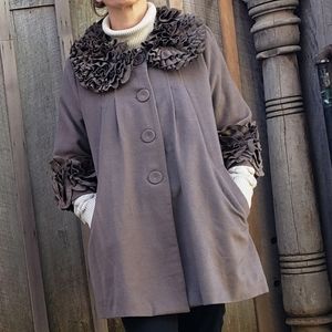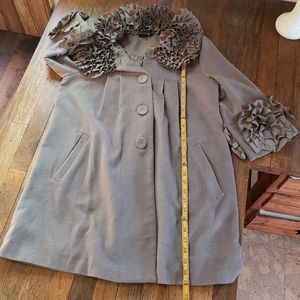 Taupe swing coat. 3/4 length sleeves. Layered ruffle details on collar and cuffs. Fabric covered button closure. Tagged a size large. Please see pictures for measurements.