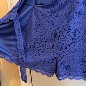 NWT The Tiki Wrap Romper takes the classic wrap dress and gives it a twist. This long sleeve lace romper dress has an asymmetrical front skirt, and is a classic romper in the back. Beckon Blue. Paradise Found Lace. Overall approx 33” shoulder to hem. Gold tone zipper still with protective plastic cover. Smoke free home.