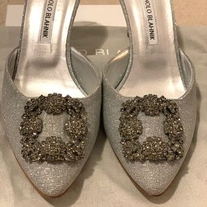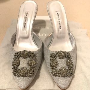 SOLD:Manolo Blahnik Hangisi Mules Silver Fabric 70