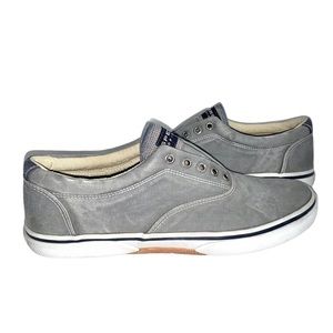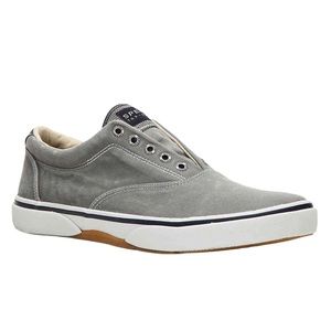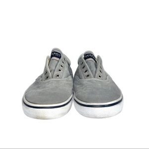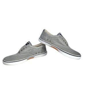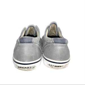 Men’s Sperry Top-Sider Halyard CVO Salt Washed Sneakers in light washed gray with white & navy-blue accents.