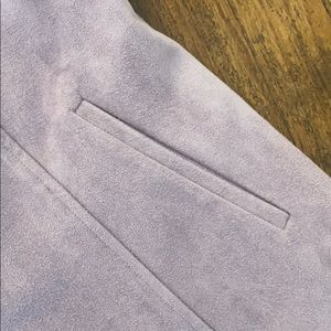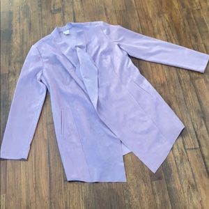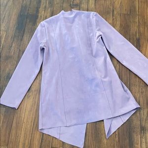 If you love softness, comfort & the color purple, you’ll LOVE this blazer! Delicate pastel purple, tunic length with open front cascading panels. Longer in front than back. It looks and feels like real suede but is machine washable! Unique, clean cut raw hems. Excellent like-new condition! Smoke free home. Approx measurements: